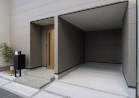 玄関横に植栽があり、家の印象がぐっと明るく華やかになります。緑が目に入ることで、ご家族やお客様を優しく迎え入れる癒やしの空間を演出できます。