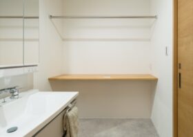 洗面脱衣室が広くカウンターもあるので、洗濯物を畳むなどの家事作業がスムーズに行えます。また、朝の身支度で家族が並んで使っても余裕があり、ゆったりと快適に過ごせます。