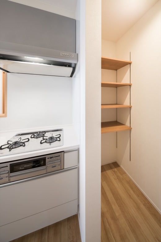 キッチン横にパントリーがあるので、常備菜や大型の調理器具をすっきり収納できます。調理スペースが片付き、生活感を出さずに効率よくお料理を楽しめます。