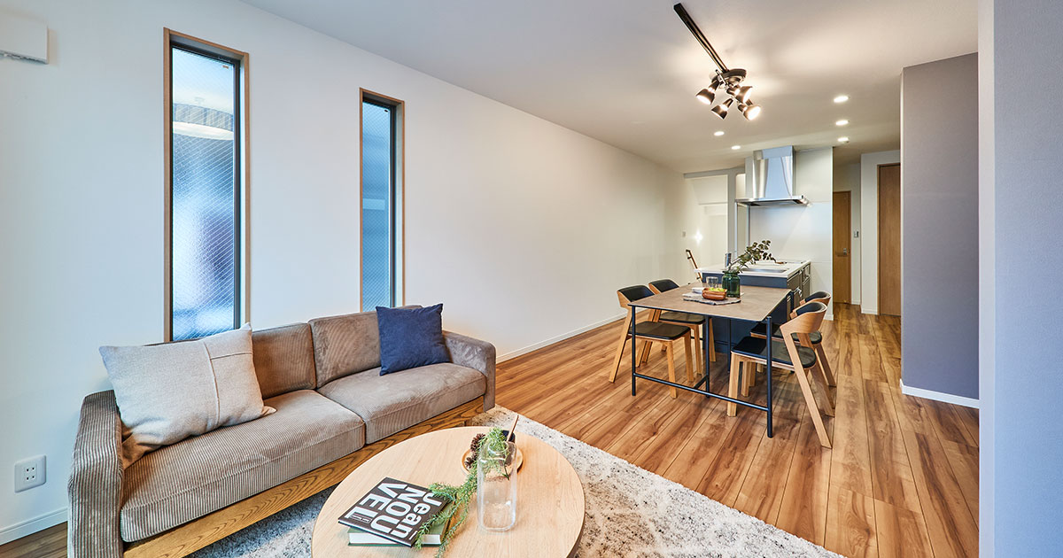 LDKの天井はコンクリート調に仕上げ、こなれ感のあるお洒落なデザインに仕上げました。インダストリアルなインテリアが似合う、カッコいい空間です。明かりを採る用の横長の窓があり、陽当たりにも配慮しています。