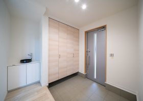 玄関は広くスペースをとってあるので来訪者にゆったりとした印象を与えます。また、上がり框の段差部分もワイドにスペースをとっているので、お子さまを一緒にお出かけの準備もできます。