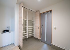高さと幅がある扉付きのシューズインクローク。可動式の棚なので、高さを調節して靴以外の物も収納できます。