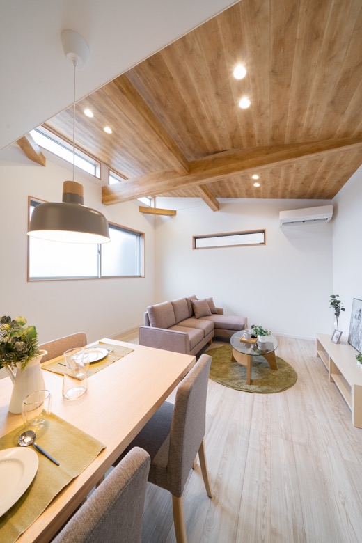 リビングの天井は勾配がついており、広がりと開放感を感じられます。開口部からは光をふんだんに取り込むことができます。