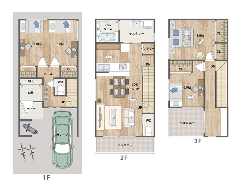 1階から3階への動線がLDKを通る設計になっており、家族が自然と顔を合わせ、コミュニケーションが生まれやすい間取りです。