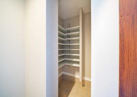 あえて扉を設けず開放的な印象のシューズインクローク、靴やブーツなどの他間のスペースにゴルフバッグなども置けます。