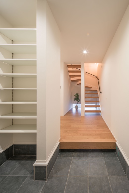 上り框をななめに設けて玄関スペースを広く感じられるよう設計しました。幅があるのでお出かけの際に混雑しにくいというメリットもあります。