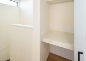 シューズインクローゼットは、両サイドに棚板が設置されているので中が見えにくく、来客時でも安心です。また土間続きなのでベビーカーなどもスムーズに収納できます。