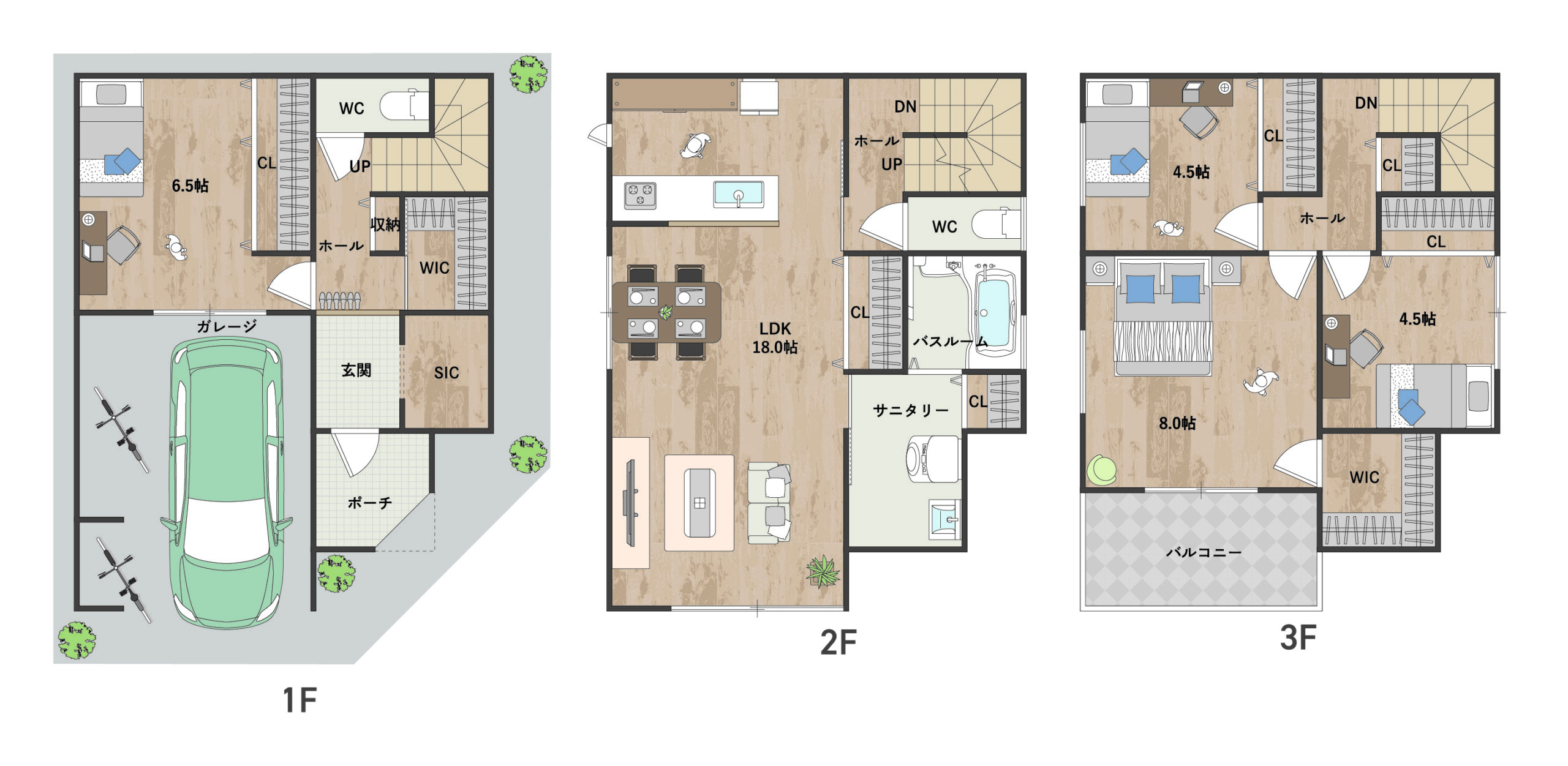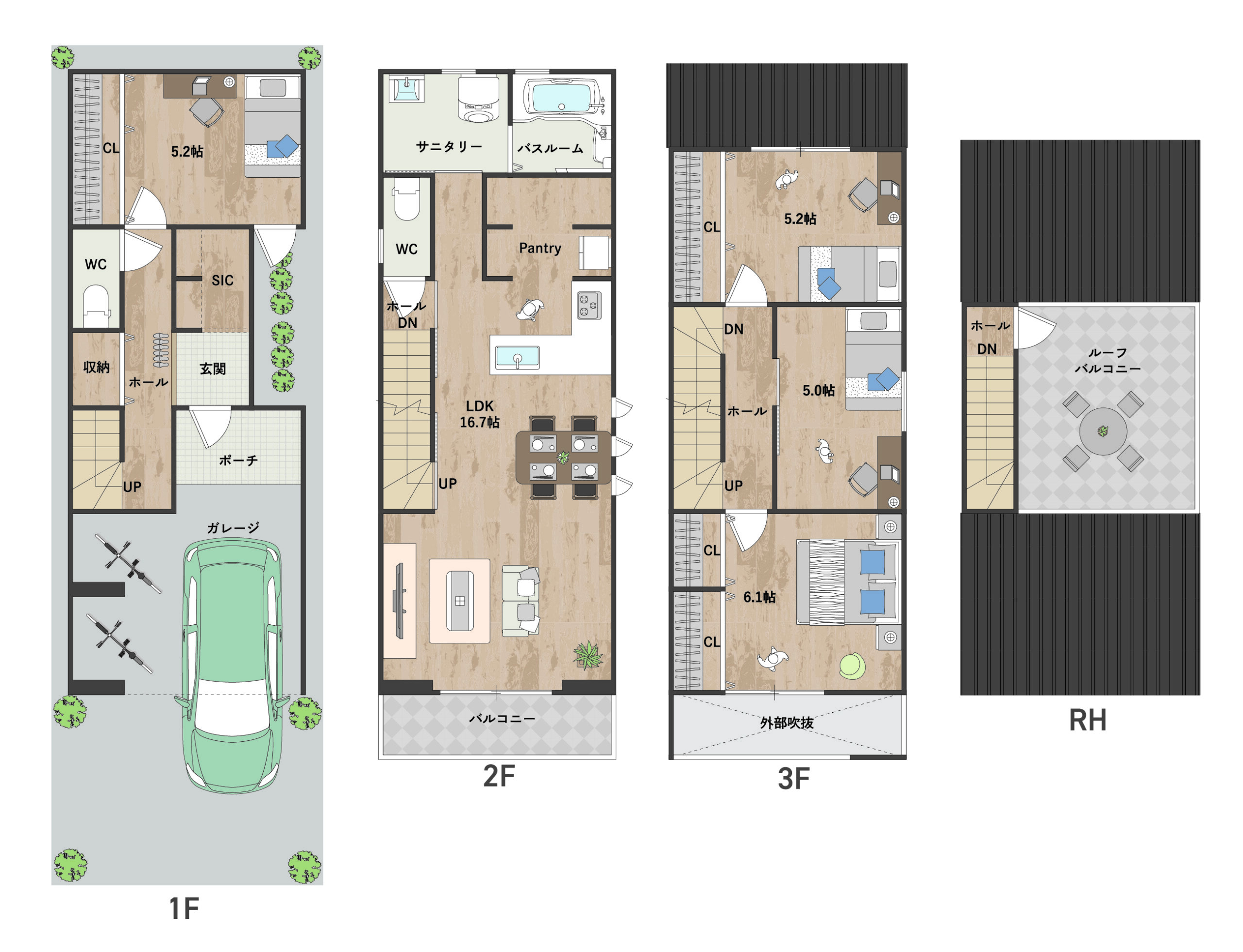 3階部分の廊下を最小限に抑え、その分各居室を6帖の広々とした空間にしました。家族一人ひとりが快適に過ごせます。