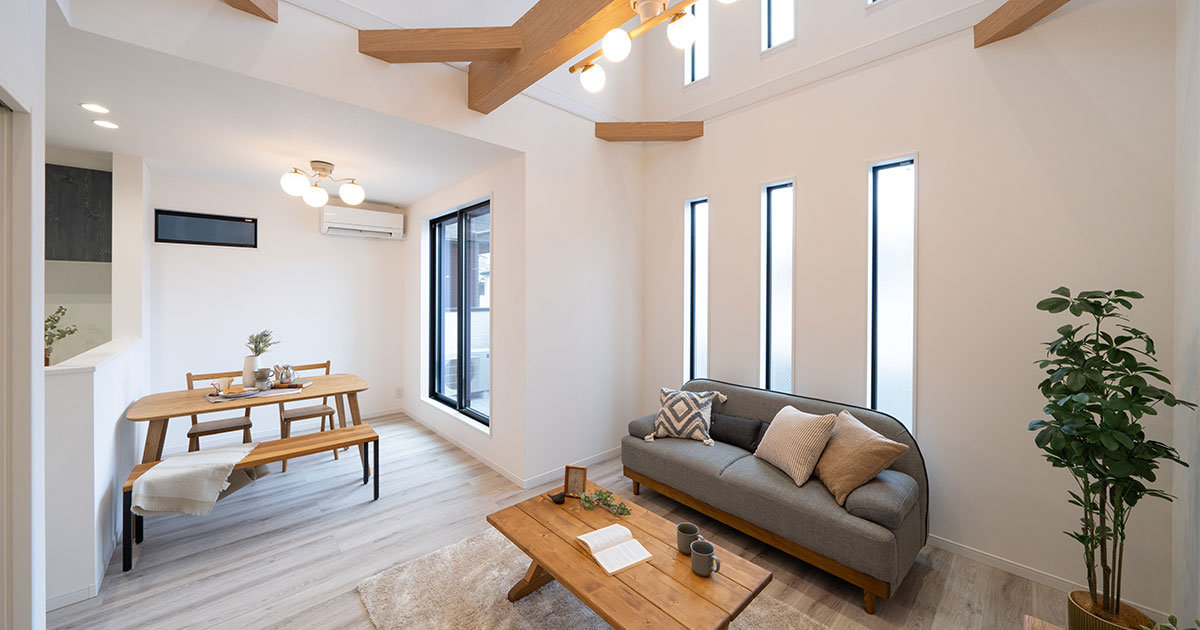 キッチン側の天井を高く上げている勾配天井を設け、空間を広く感じるLDKです。あえて南側を高く上げ、壁面に三連窓を設けることで光をしっかり取り込むことができ、部屋を明るくしています。