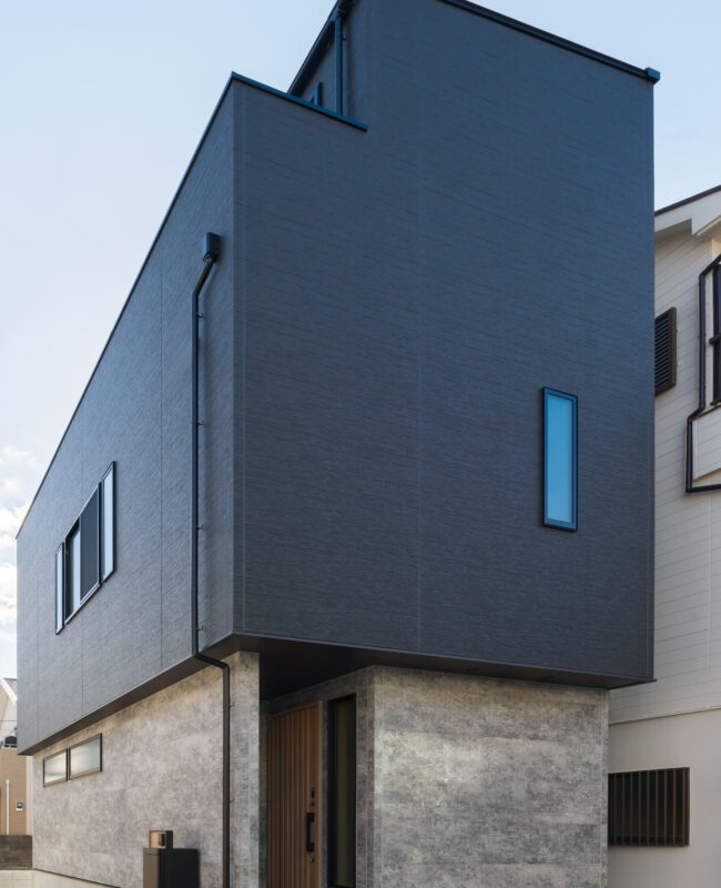 立体的なフォルムに、タイル調のアクセント壁が重厚感をプラス。光と影のコントラストが建物の表情を豊かにし、街並みの中でも洗練された存在感を感じさせます。