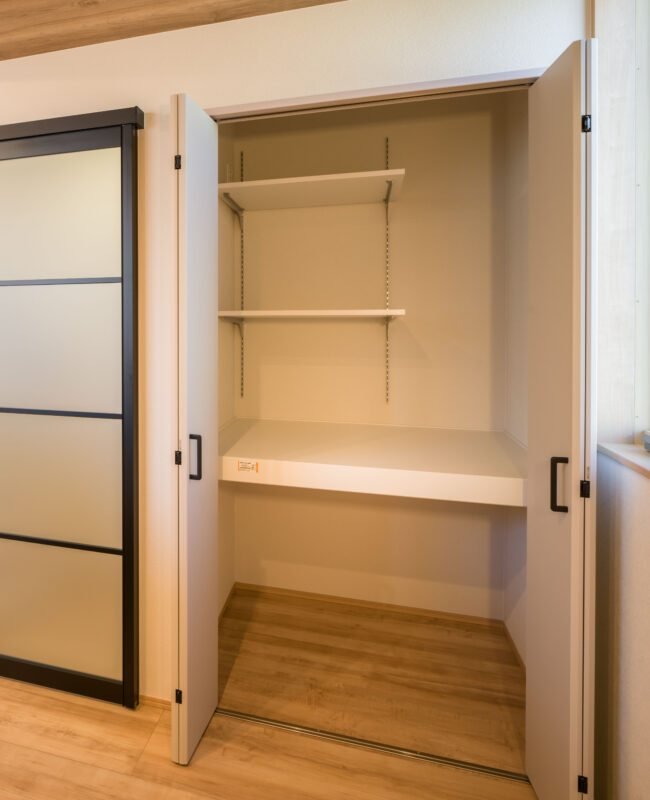 収納内部には高さが調整できる可動棚を採用しました。日用品のストックから掃除機、書類まで、収納したい物のサイズに合わせて棚を動かせるため、デッドスペースが生まれません。