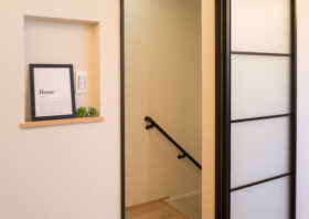 壁の厚みを利用した「ニッチ」。インターホンやスイッチ類をまとめてスッキリさせたり、思い出の写真や季節の小物を飾るギャラリースペースとしても活躍します。