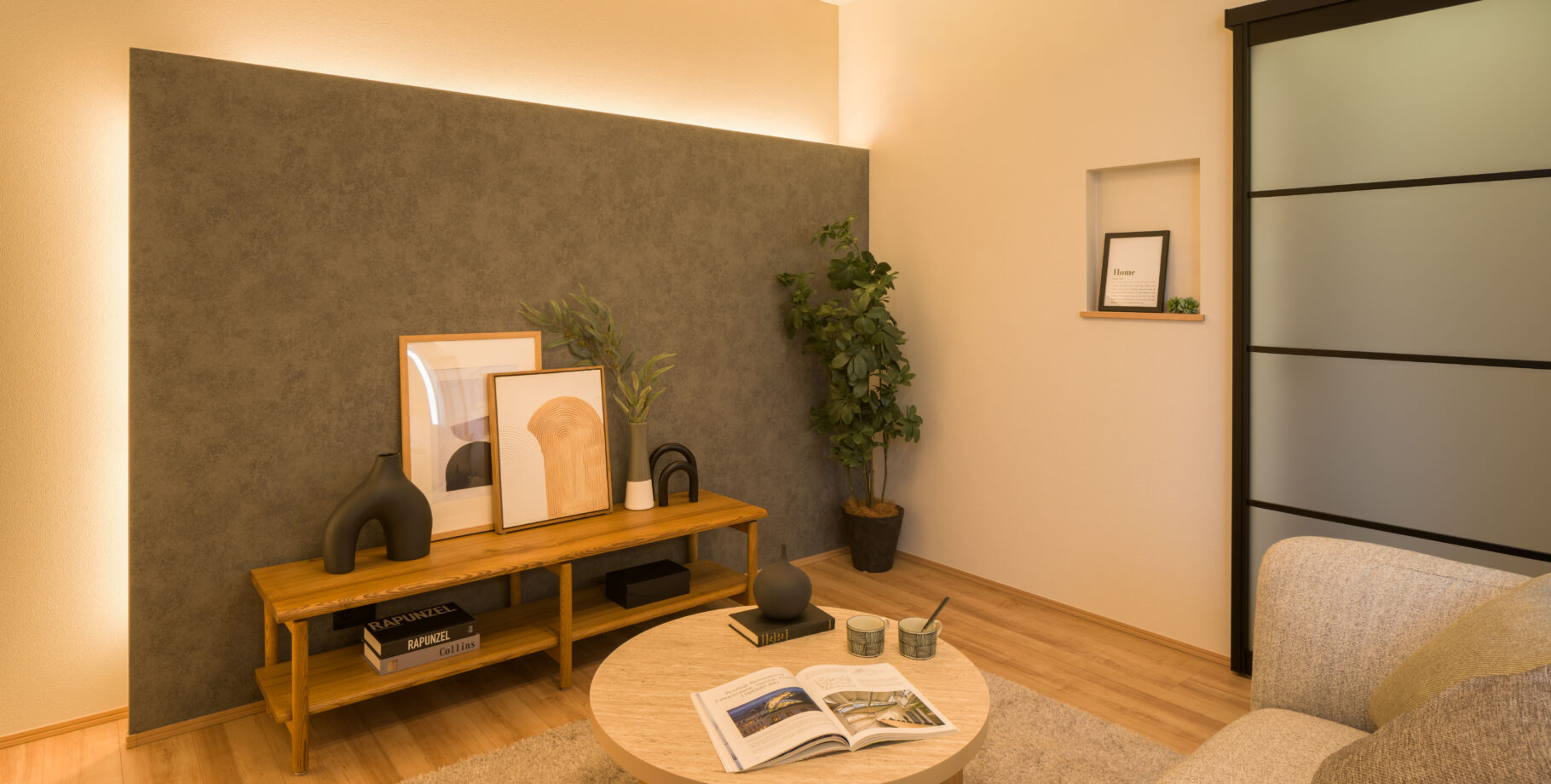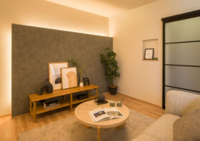 リビングの壁面には、柔らかな光が広がる間接照明を設置しました。夜はメイン照明を落として、ホテルのラウンジのような落ち着いた雰囲気の中でリラックスタイムを楽しめます。