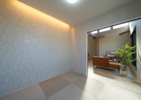 明るい採光が特徴の和室。仕切り戸で独立空間にもなり、客間や子どもの遊び場として多用途に活用可能です。