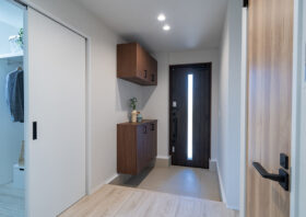 奥行きのある広々とした玄関は、家族全員が同時に準備をしても混雑せず快適。来客時にも余裕を感じる設計です。