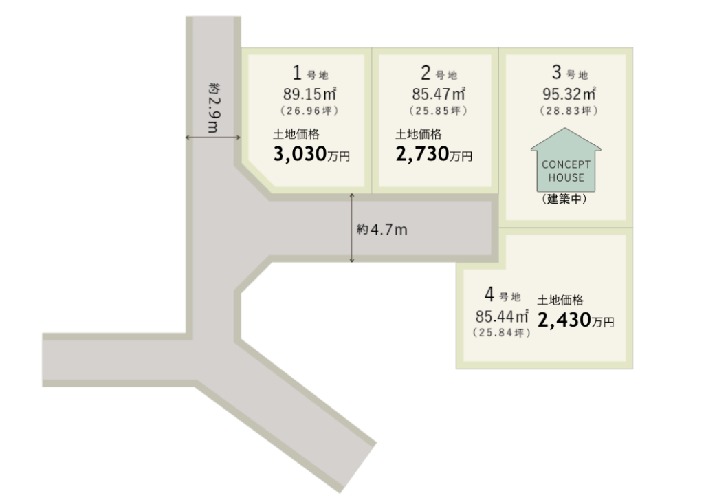 | 4号地 | 85.44㎡(25.84坪)※建築条件付土地 |