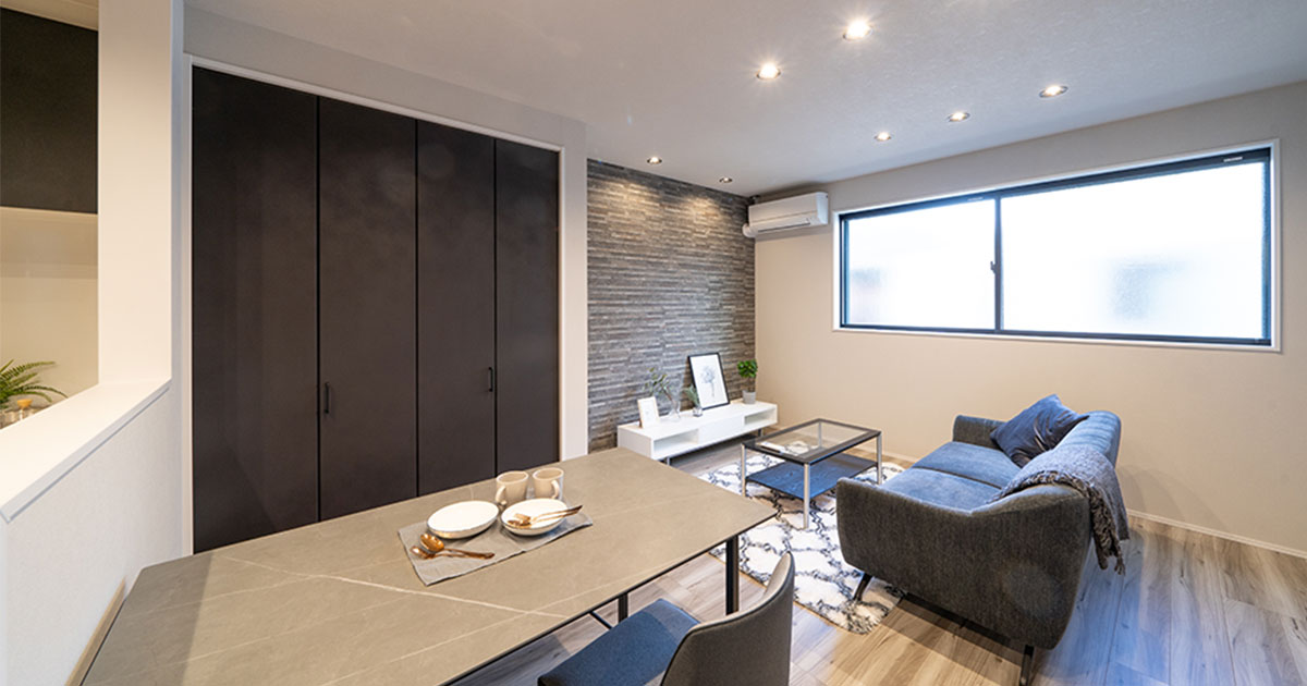 狭い敷地の建物でありながら、開放的なLDKを実現。窓を壁いっぱいに取ることで、部屋全体が明るく、また、開放的な空間になるので、快活に過ごすことができます。狭小地でも工夫次第で広く感じる部屋を作ることは可能です。