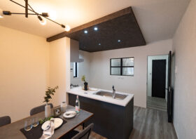 キッチンの天井を一段下げることで、空間に心地よい落ち着きと独立した雰囲気を与えます。視覚的なメリハリが生まれ、LDK全体を立体的で洗練されたおしゃれな印象に仕上げます。