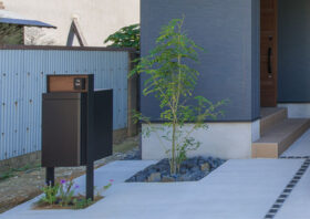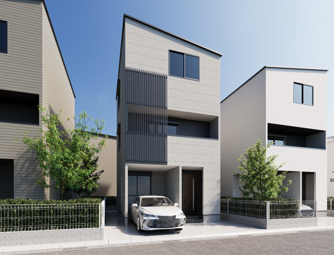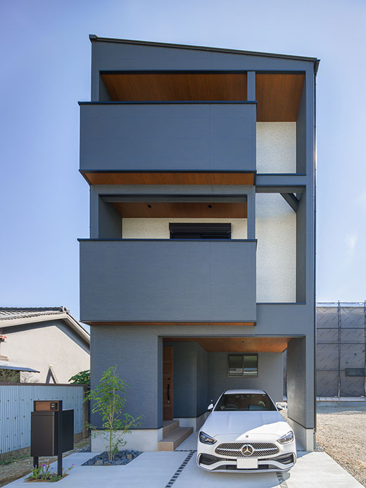 建物の外観は、縦長の滑り出し窓を採用することで縦方向のラインを意識し、カラーもブラック系で統一したスタイリッシュなデザインに仕上げています。