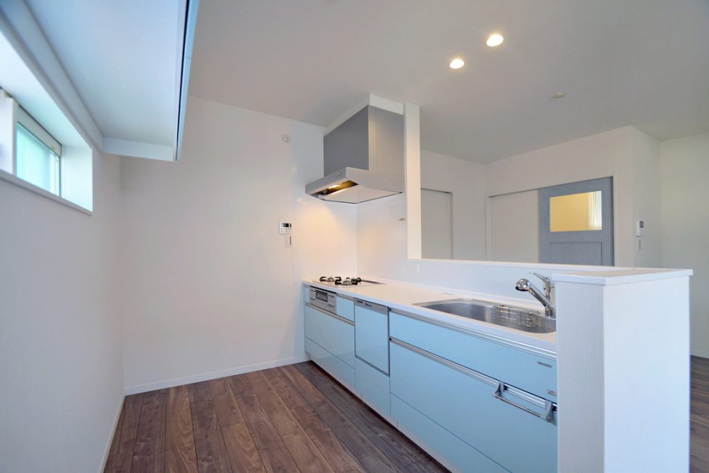 - Q4●キッチンの扉カラーに、さわやかな明るいブルーを選ばれ、リビングのアクセントクロスでは、ブルー系でも、ほっとするような質感のクロスを選ばれています。