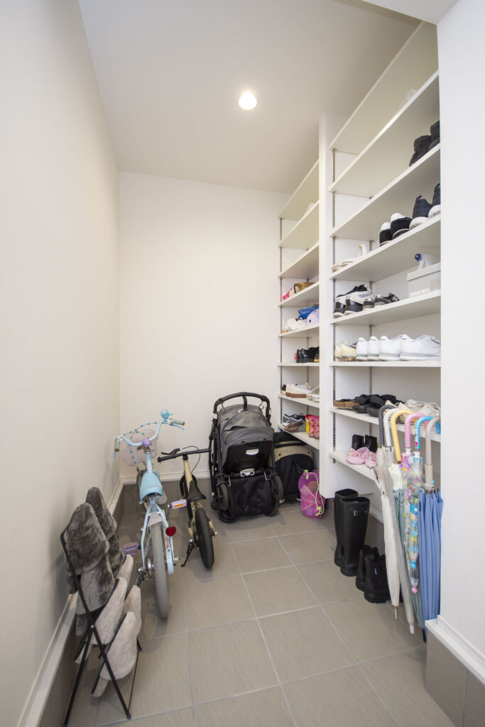 こだわりの玄関横のシューズインクローゼットは家族全員の靴や荷物を余裕で収納できほどの広さを確保。