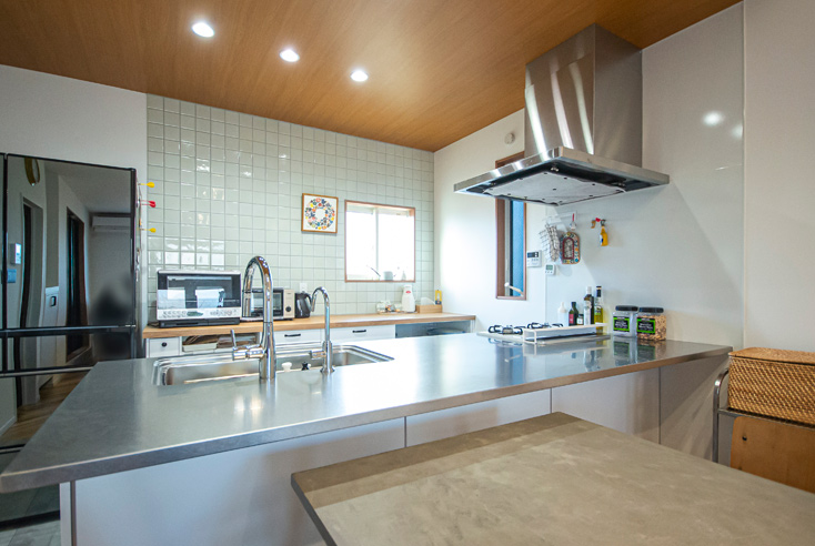 清潔感がありスタイリッシュな印象のステンレス天板は奥さまのリクエスト。奥さまのご要望をご主人が聞きながら決めていったそうです。
