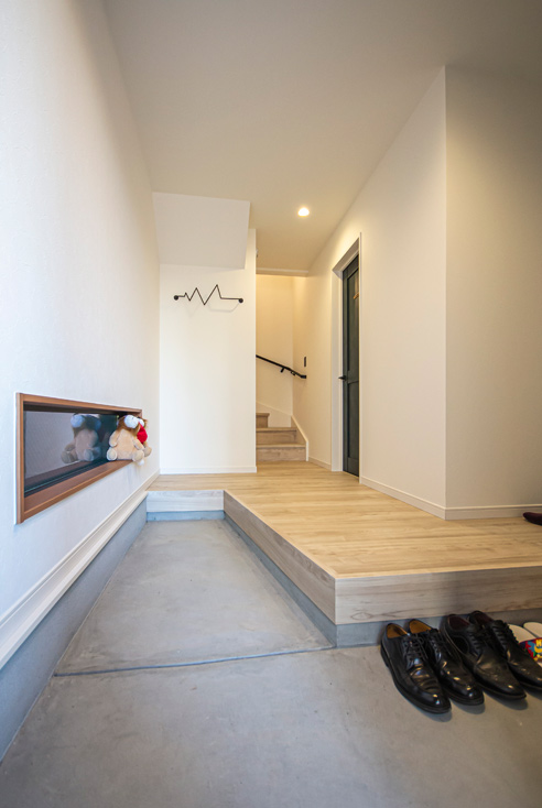 ゆとりのある広さの玄関は土間がL字型になっており、お客様をたくさん招いたときなど靴の脱ぎ履きがスムーズにできます。